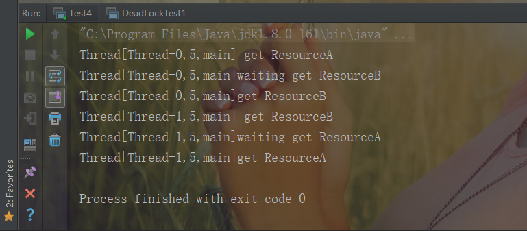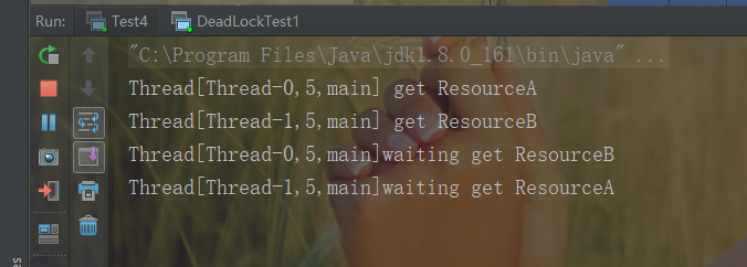 从输出结果可以知道线程调度器先调度了线程 A,也就是把 CPU 资源让给了线程 A,线程 A 调用了 getResourceA() 方法,方法里面使用 synchronized(resourceA) 方法获取到了 resourceA 的监视器锁,然后调用 sleep 函数休眠 1s,休眠 1s 是为了保证线程 A 在执行 getResourceB 方法前让线程 B 抢占到 CPU 执行 getResourceB 方法。