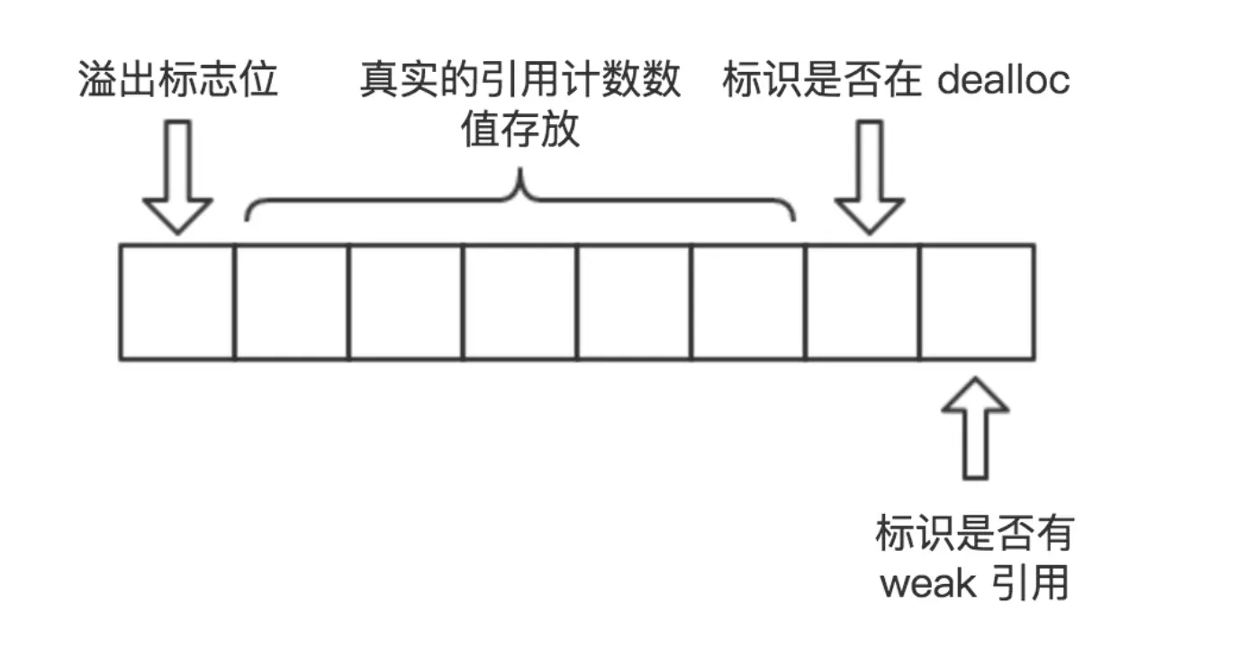 RefcountMap:对象具体的引用计数,没错就是他,所有strong等可以是引用计数+1的操作都会在这里标记, 因为一个SideTable可能有多个对象的计数器,SideTables[0x0000]和SideTables[0x0x000f] 可能都是同一个SideTable,所以苹果又提供了table.refcnts.find[0x0x000f]来找到真正的引用计数器 计数器的存储结构: