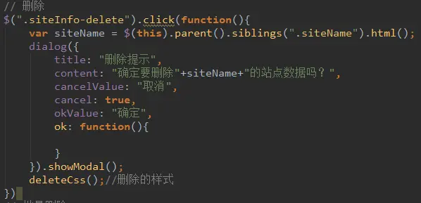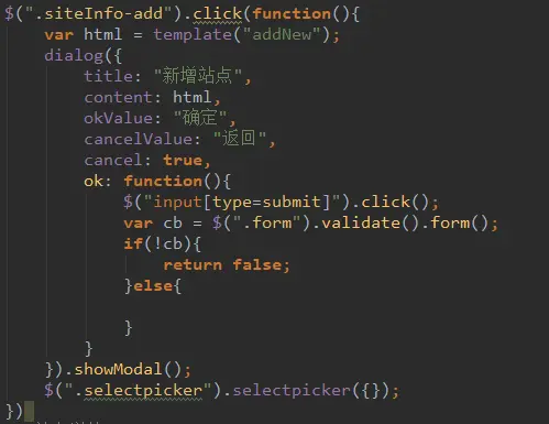 看了代码也就知道dialog的基本用法了,title表示弹窗的标题,content表示弹窗的内容,本例子使用了template来载入弹窗的内容,template的代码就不展示了,如果是删除弹窗的话,content的内容可直接写为“是否确定删除该条目?”;okValue表示确定按钮中的内容;cancelValue表示取消按钮中的内容,ok中可写一个函数,函数中的内容即为点击完“确定”按钮后要执行的函数。