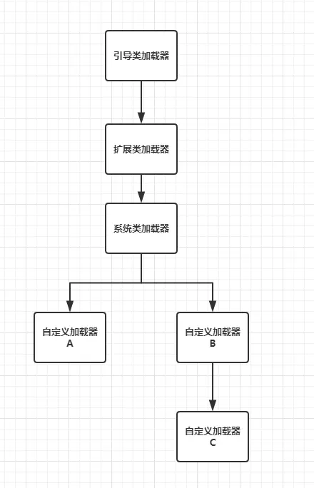 类加载器一共有4种,分别是引导类加载器(bootstrap class loader)、扩展类加载器(extensions class loader)、系统类加载器(system class loader)、自定义加载器,它们之间的加载关系如下图所示:
