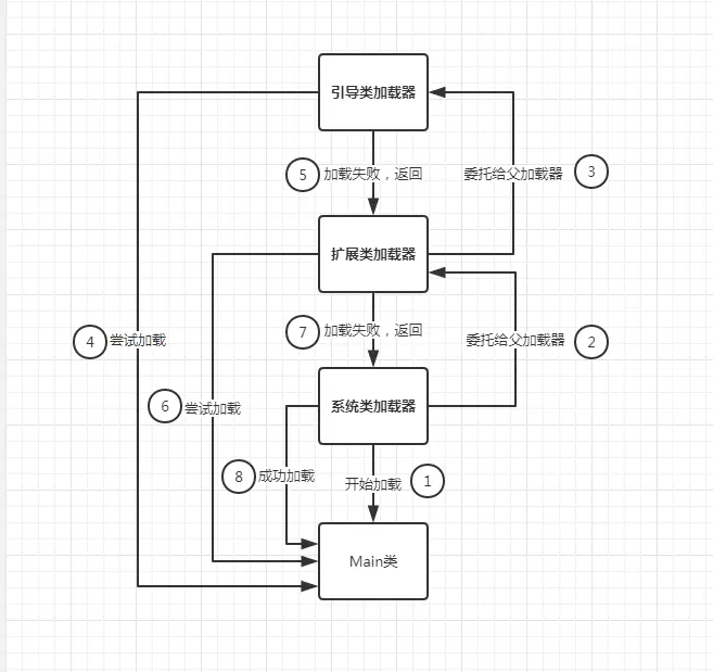 以上文中的Main类的加载过程为例,它的加载器为系统类加载器。但是系统类加载器不会直接去加载这个类,而是先委托给它的父加载器,也就是扩展类加载器。同样,扩展类加载器也会先委托给它的父加载器,一直委托到引导类加载器才开始真正的尝试加载,如果加载失败就返回由发出委托的加载器尝试加载。