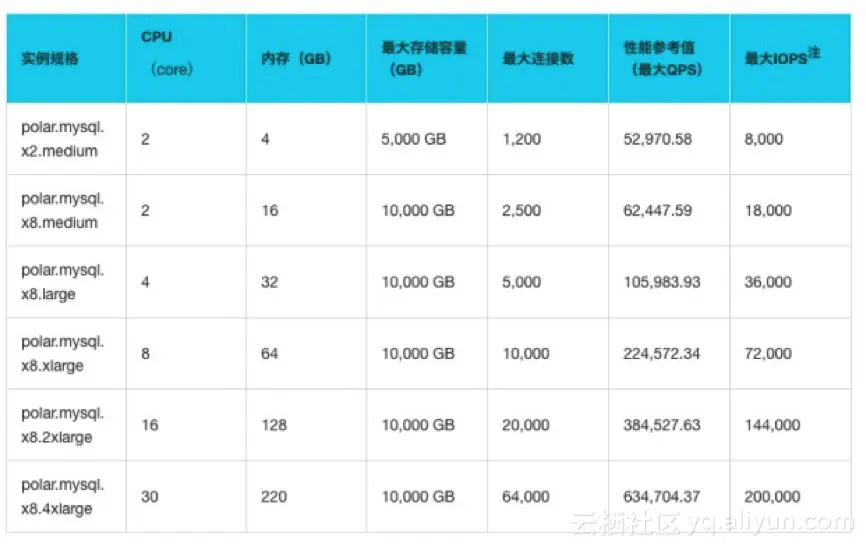 POLARDB支持的实例规格如下。