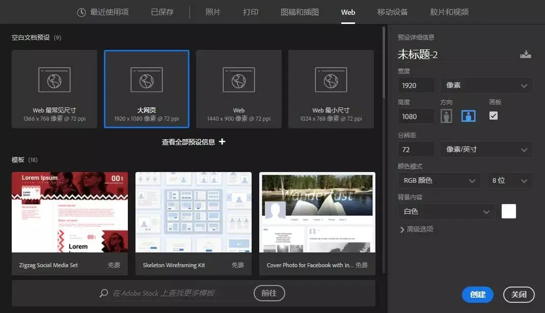 新建界面设置:宽度1920px,高度不确定,分辨率为72