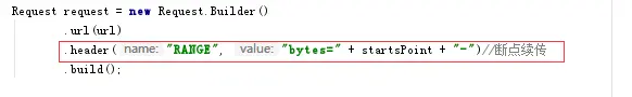 .header("RANGE", "bytes=" + startsPoint + "-")//断点续传