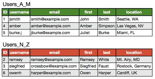 实际情况中往往会是垂直拆分和水平拆分的结合,即将Users_A_M和Users_N_Z再拆成 Users和UserExtras,这样一共四张表