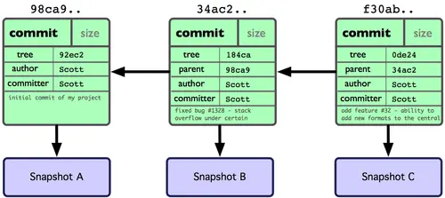 所有的 Git 对象都以这种方式存储,惟一的区别是类型不同 ── 除了字符串 blob,文件头起始内容还可以是 commit 或 tree 。不过虽然 blob 几乎可以是任意内容,commit 和 tree 的数据却是有固定格式的。