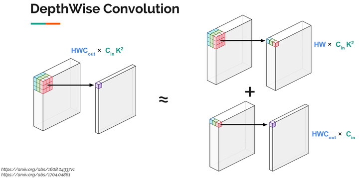 今年谷歌提出的MobileNet,利用了一种被称为DepthWise Convolution的技术,将神经网络运行速度提升许多,它的核心思想就是把一个卷积操作拆分成两个相对简单的操作的组合。如图所示, 左边是原始卷积操作,右边是两个特殊而又简单的卷积操作的组合(上面类似于池化的操作,但是有权重,下面类似于全连接操作)。
