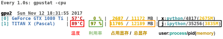这里推荐一个好用的小工具:gpustat,直接pip install gpustat即可安装,gpustat基于nvidia-smi,可以提供更美观简洁的展示,结合watch命令,可以动态实时监控GPU的使用情况。