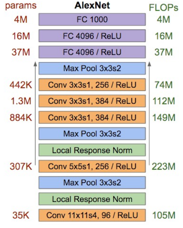 AlexNet的分析如下图,左边是每一层的参数数目(不是显存占用),右边是消耗的计算资源. 这里某些地方的计算结果可能和上面的公式对不上, 这是因为原始的AlexNet实现有点特殊(在多块GPU上实现的).
