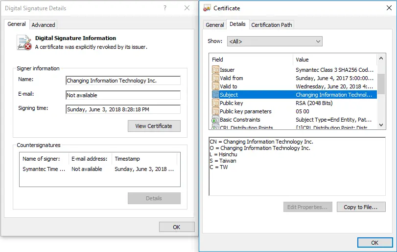 “ESET的安全研究人员最近确定了两个恶意软件系列,这些恶意软件系列之前与网络间谍组BlackTech有关,这些恶意软件系列是使用属于D-Link网络设备制造商的有效数字证书和另一家名为Changing Information Technology的台湾安全公司签署的。”