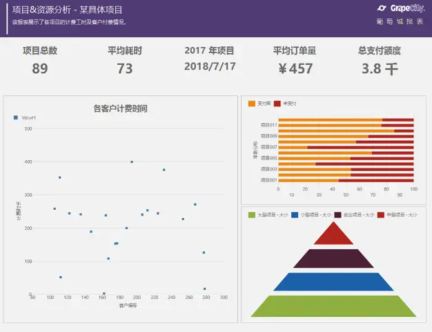 无论是在大型工程、软件开发、系统制造之类的项目管理中运用报表数据分析的方法及时掌握项目运行情况,也能科学准确的预测项目成本与风险。常见的会将项目中的各种资源、工时、材料、效能等数据形成分析报表、大屏看板。