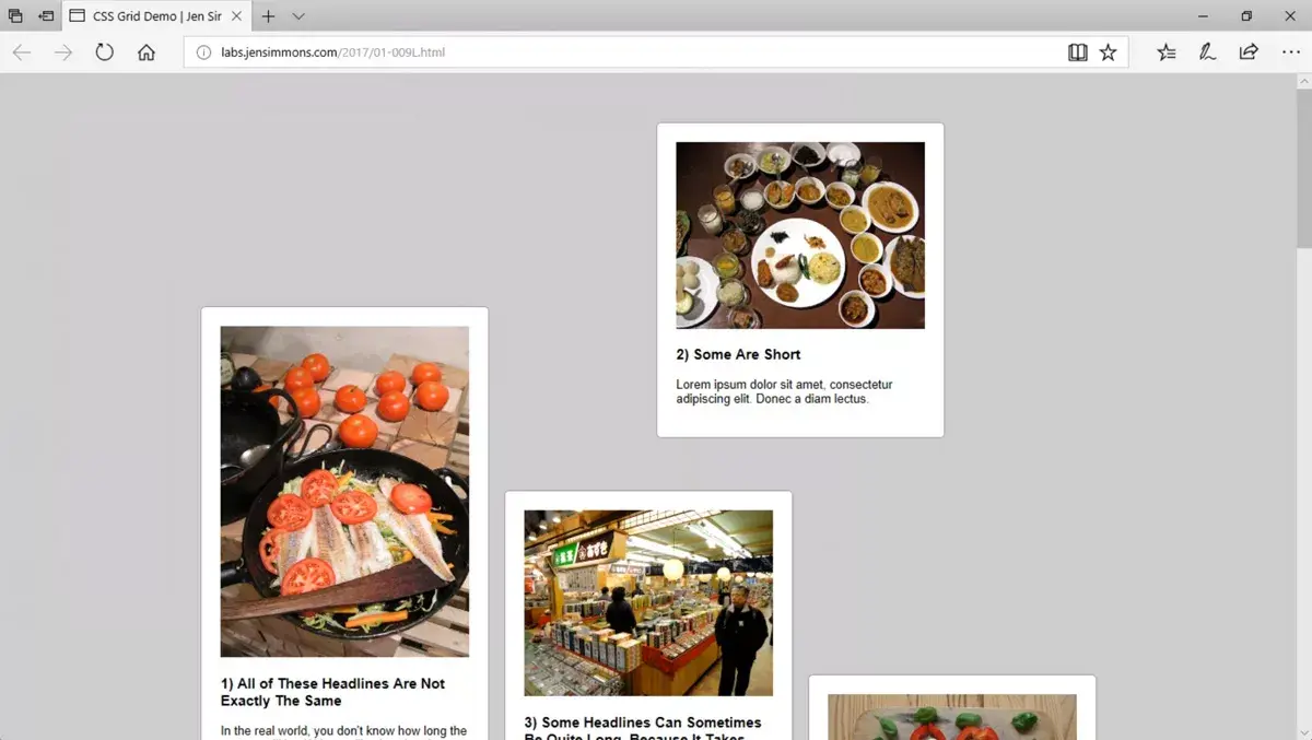 网格系统同时促进了传统和非传统的布局方式。这里有一个网格布局的案例来自于 Jen Simmons 的实验室,可以再 Edge 16 上浏览。如果你更喜欢在非 Windows 上用 Edge 浏览,你也可以在 BrowserStack 上浏览 (需要账户)。