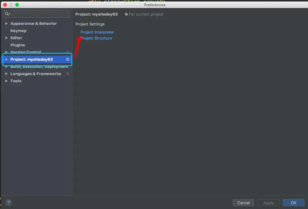 进入Pycharm以此选择功能键PYcharm--Preferences--Project--Project Interpreter--(+)--搜索Django,具体如下图所示
