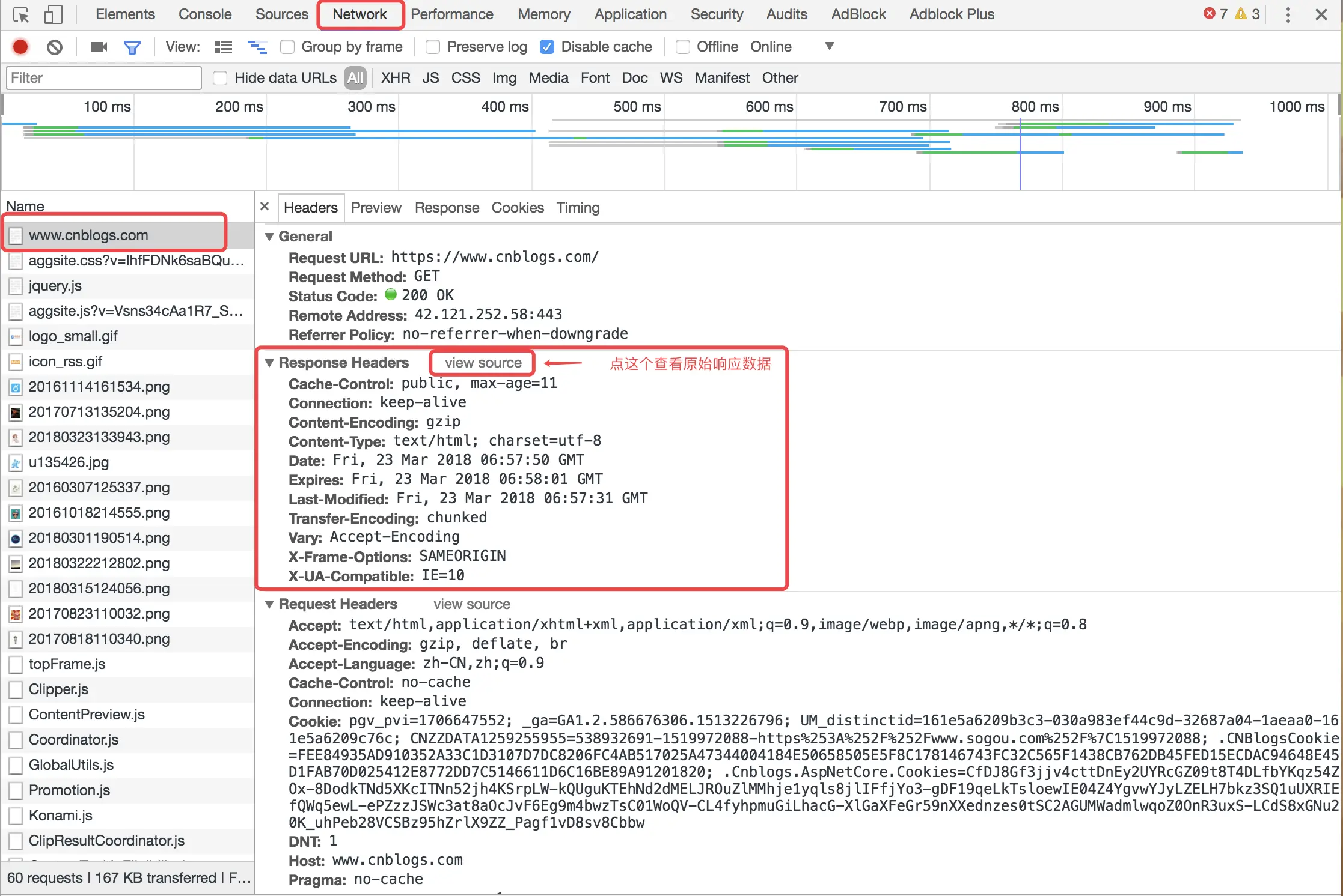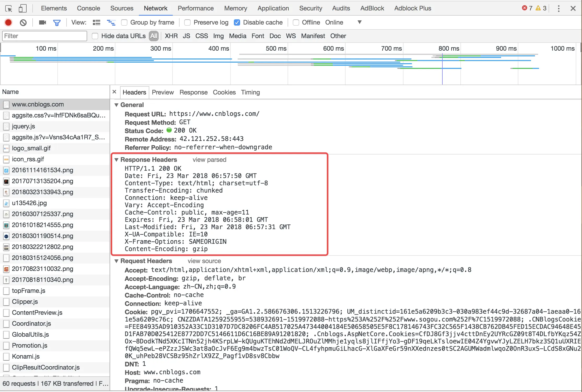 然后我们再看一下我们访问博客园官网时浏览器收到的响应信息是什么。