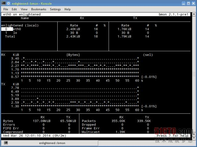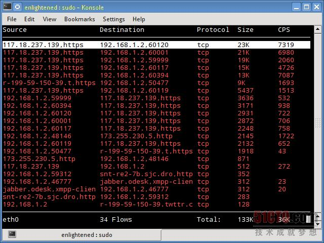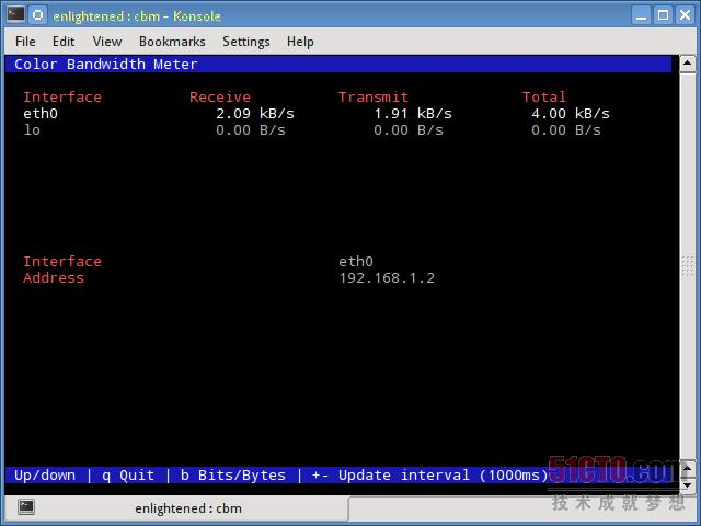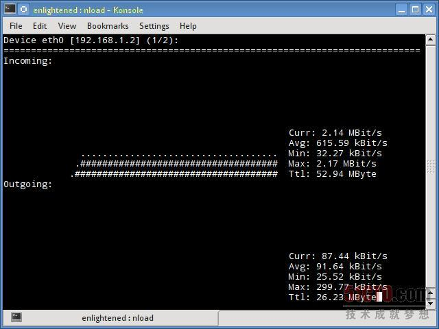 这是一款小巧简单的带宽监控工具,可以显示通过诸网络接口的流量大小。没有进一步的选项,仅仅实时显示和更新流量的统计信息。