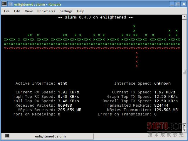 slurm是另一款网络负载监控器,可以显示设备的统计信息,还能显示ASCII图形。它支持三种不同类型的图形,使用c键、s键和l键即可激活每种图形。slurm功能简单,无法显示关于网络负载的任何更进一步的详细信息。