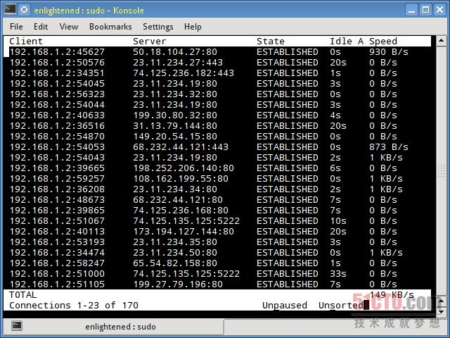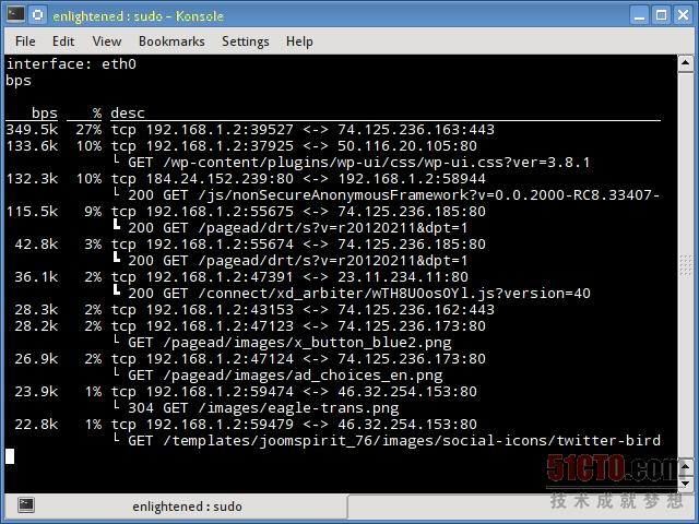 tcptrack类似iftop,使用pcap库来捕获数据包,并计算各种统计信息,比如每个连接所使用的带宽。它还支持标准的pcap过滤器,这些过滤器可用来监控特定的连接。