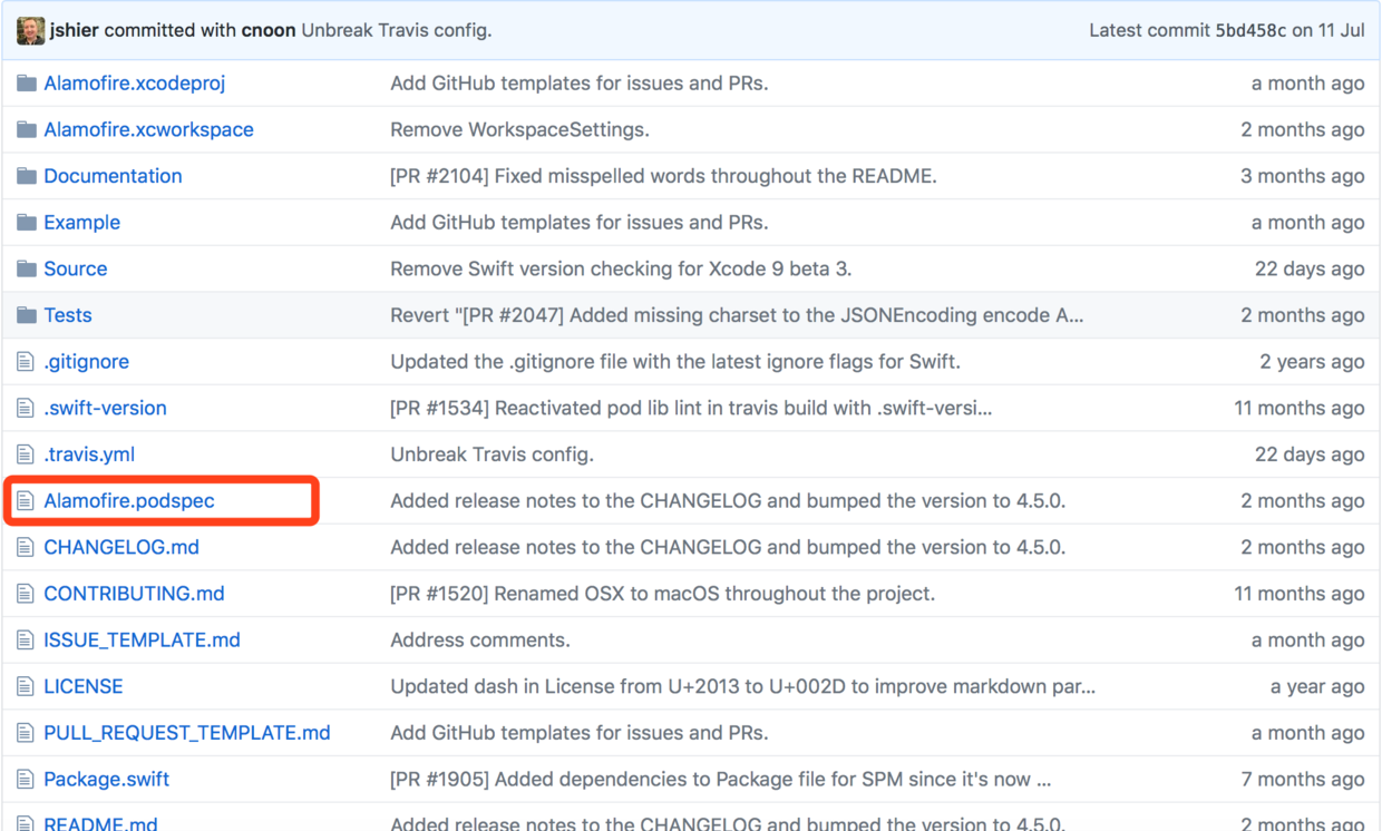 本文以Alamofire开源库为事例介绍 CocoaPods 管理项目所需文件。CocoaPods根据模块说明书管理来定位项目地址。