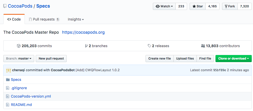 安装过程中其中一步就是Clone这个标准仓库,我们简称master repo。存放在这个repo中的项目是均开源的,任何根据模块地址寻找到项目都是可下载的。我们把podspec文件上传给CocoaPods的master上,当别人配置好CocoaPods就会把我们的podspec.json下载到~/.cocoapods/repos/master/下,用户要使用Alamofire查找本地~/.cocoapods/repos/master/ 找到这个Alamofire.podspec.json文件根据内容下载配置。