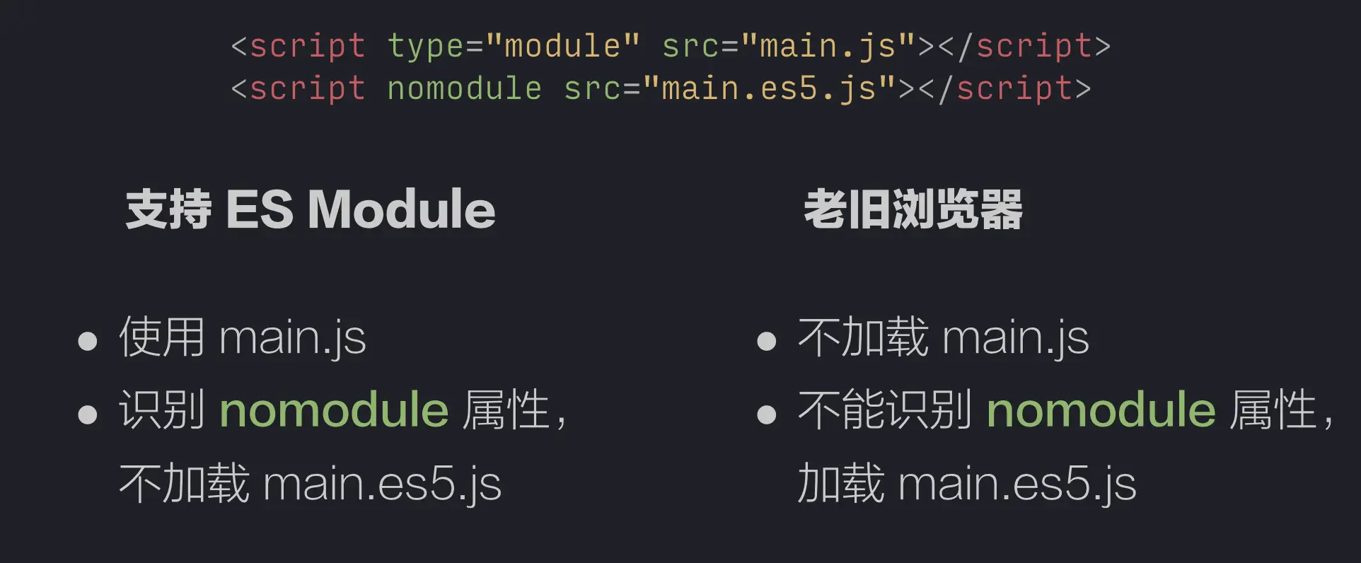 而不支持 <script type="module"> 的老旧浏览器,会因为无法识别这个标签,而不去加载 ES2015+ 的代码。另外老旧的浏览器同样无法识别 nomodule 熟悉,会自动忽略它,从而加载 ES5 标准的代码。