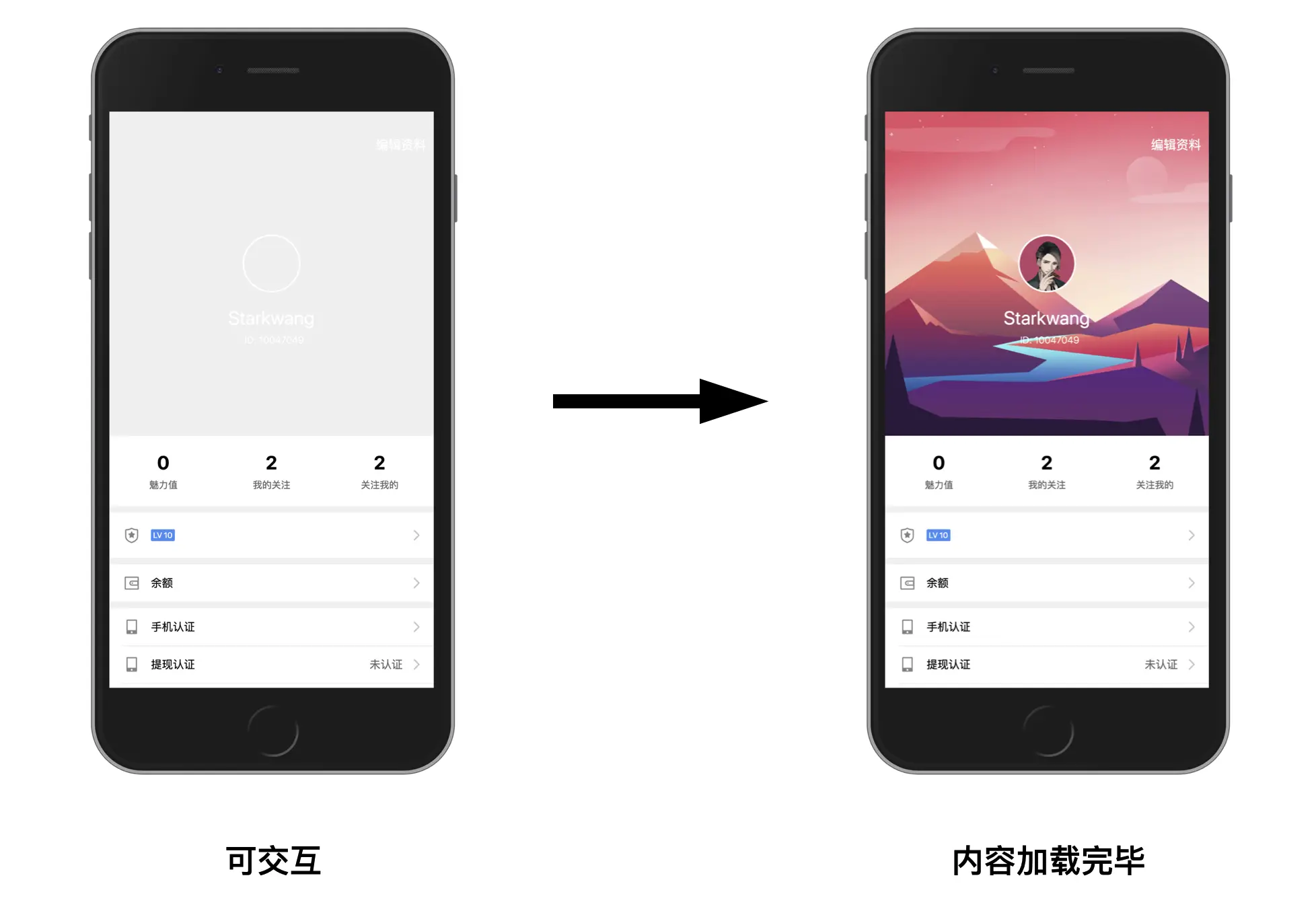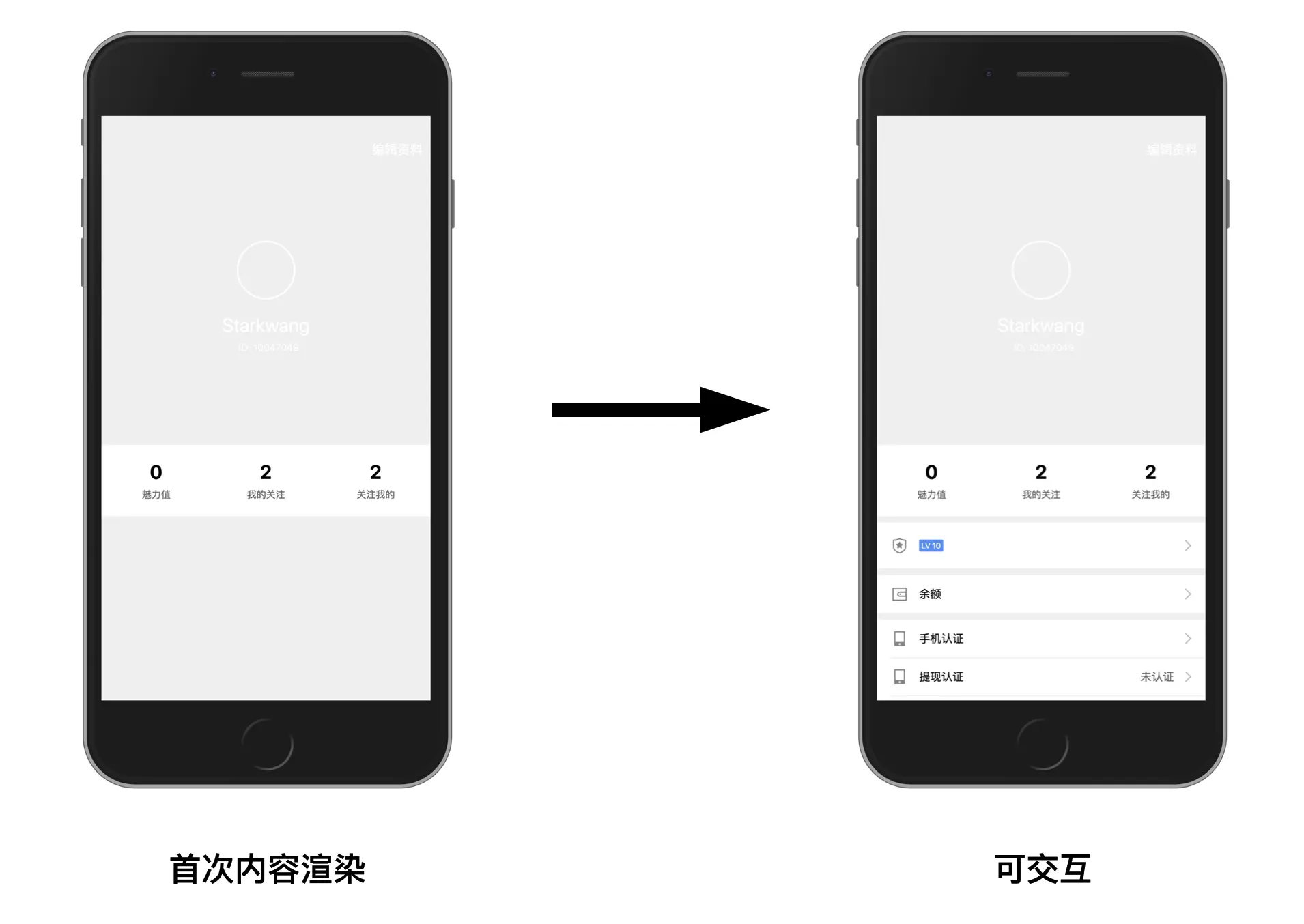 以这个用户主页为例,起码有三处组件是不需要首次加载的,而是使用动态加载:标题栏、Tab 栏、列表。首次加载实际上只需要加载中心区域的用户头像、昵称、ID即可。切分之后,首屏 js 体积从 40KB 缩减到了 20KB.