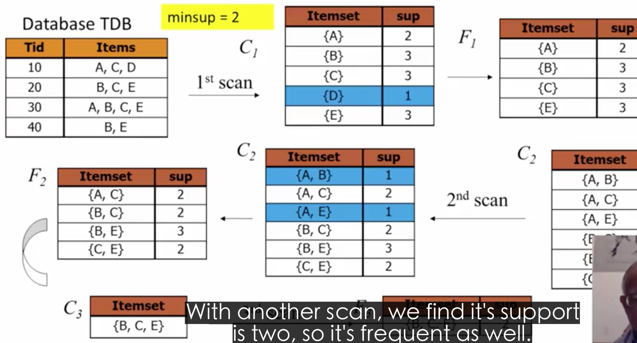 对于一个很大的数据库来说,分区之后,如果某一项是频繁的,意味着至少存在一个分区,它也是频繁的,所以,第一次扫描数据库,先把当前分区的数据全部收入内存,然后计算出当前分区的所有频繁集,然后把所有的频繁集统一收作全局代表。再过滤出全局频繁的,整个过程只有两次扫描数据库【有点小把戏,把数据缩小到内存中能放下,在内存中算】