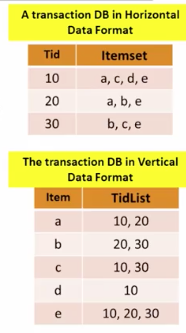 - ECLAT(Equivalence Class Transformation):一般的数据库是根据项ID和项值来存储的,这里的主要思想是把唯一的项值提出来,对应列放在数据库中的项ID列表。