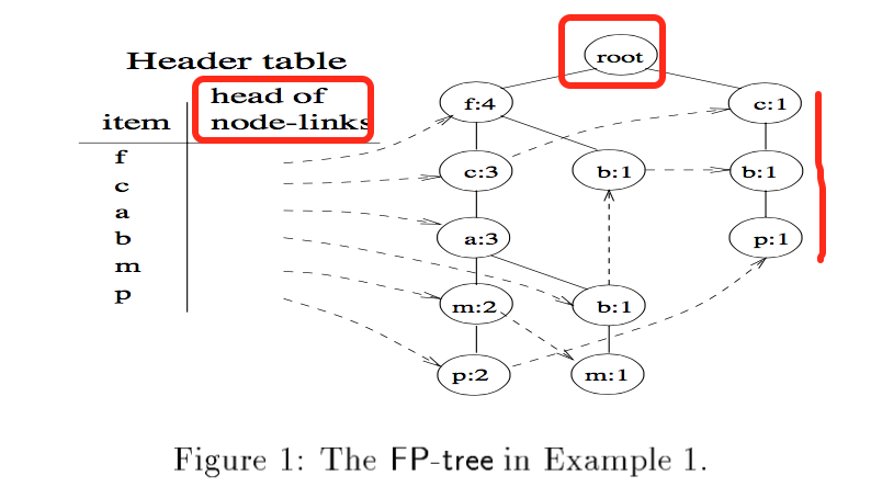 - 它包含了一个root,被标记成null,root有每一项作为前缀的子项,同时有一张表记录了频繁项的头;