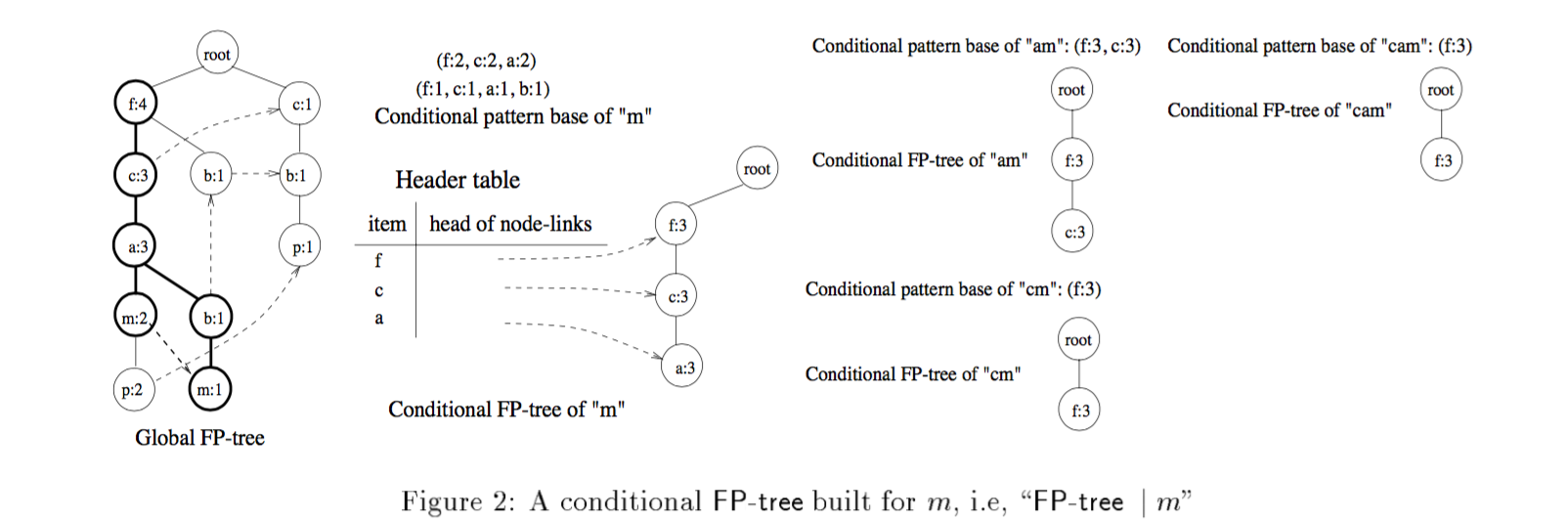 经过FP定义构建好FP-tree之后,这时它的跟节点是root,可以称作全局树,然后根据header table给定的顺序,从末尾的项,选择一个元素P,以它为条件,构建FP-tree,称作P条件先的FP-tree,构建策略是从P开始往上寻找父节点,count值则是以P为基础,构建结果后,一直到最终只剩下一个元素,挖掘结束