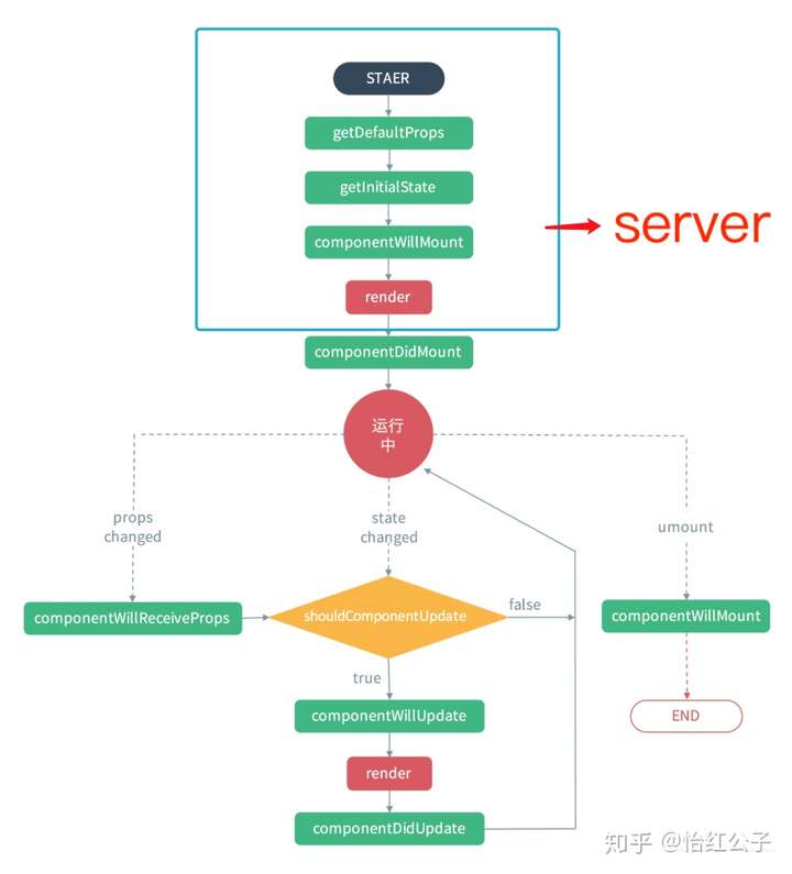 通过上面的图我们可以清楚的了解运行在 Node 中 React 的生命周期,在服务端渲染的时候我们没有 componentDidMount 这个生命周期,只会执行到 componentWillMount 这个生命周期,那我们可以把请求放在这里面吗?还有我们的请求是异步的,那我们的能在生命周期里用async/await 吗?显而易见,都是否定的。因为React在调用生命周期是同步式的调用,很多新人在这里会掉进坑里。那使用不了async/await,那我们就不能再生命周期里去处理请求,因为请求是异步的,渲染是同步的。那我们该把请求放在哪里呢?我们可以把请求放入componment 的 constructor 里然后在路由 match 中获取所有需要渲染的 componment,然后把所有的请求放入到请求池中,利用 Promise.all 和 ThinkJS async/await 的特性,就可以在渲染组件前获取到所需要的数据,详情可以见下面的代码。