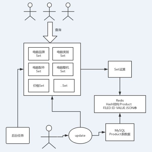 将MySQL中的数据加载至Redis中,给定条件,直接遍历Hash数据进行查询。如果就这样简单的设计的话,对于京东这样的大流量平台,每天有非常多的人进行商品搜索,而且每个人搜索的条件还不一样,根本无法快速响应。