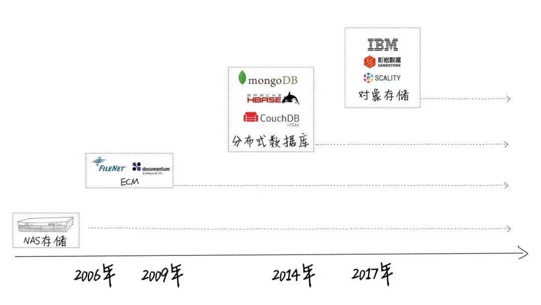为了解决银行、保险关键系统(如:柜台、信贷、承保、理赔等)的海量票据、证件、合同等文件数量庞大且不断累积导致的存储性能和扩展性瓶颈问题,金融行业非结构化数据存储的技术发展经历了四个阶段: