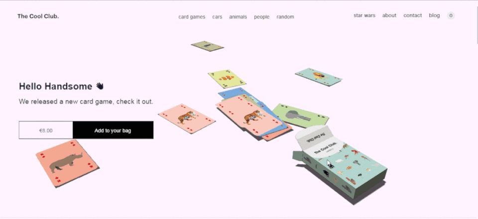 该网页点击即可一张张发牌的桥牌游戏,鼠标悬停即可触发的文字抖动特效,能够有效突出站点产品的大量留白的使用,以及其它多样的微交互,让页面内容丰富而有趣,突出其产品和网页特色的同时,以吸引用户停留,最终实现其商业价值。