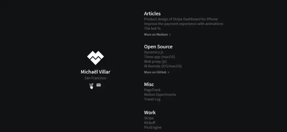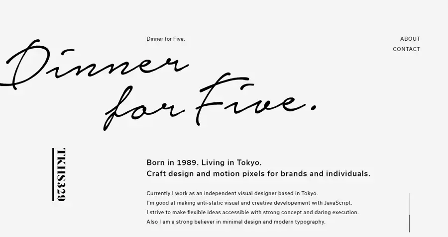 该款作品集网站着陆页,虽然仅仅选用了文本以展示页面内容,但设计师却巧妙的通过文本字体,尺寸以及排版的不同,展现出直观清晰的页面层次结构,巧妙的避免了页面因单纯文本展示而容易出现的内容繁杂,无重点,可读性差等问题。