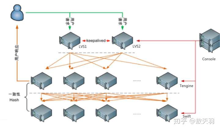 接下来这张图,我就有点编不下去了,在阿里,主要使用 LVS + Tengine 做负载均衡,然后用 Swift 做 HTTP 缓存。这是他们自己说的,但是和我没什么关系,我主要讲的是左边那个花括号的一致性 Hash。
