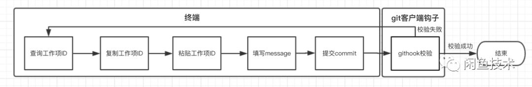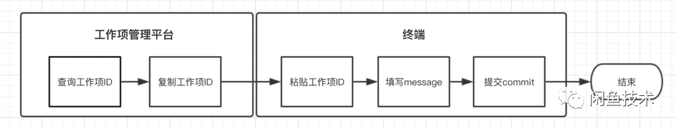 这是最容易想到的一个方案,我们每次commit时,message是自己填写的,那么我们只要按照规范,手动将工作项ID填入commit message,再在尾部追加链接即可。实际上,目前有些团队确实是使用该方式关联代码与工作项的。该方案的流程图如下: