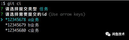 既然我们已经能通过命令行工具做到查询工作项ID,那么我们是不是可以用命令行工具来提交代码呢?答案是肯定的。我们给命令行工具增加了一个 git ci命令用于代替 git commit。当在终端输入 git ci,会出现工作项ID选择的交互。
