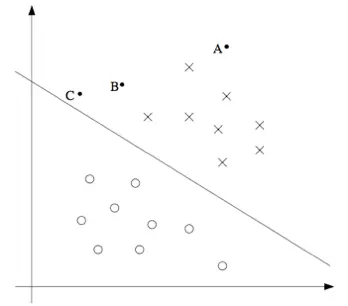还有另外一种的直观表示,例如下面这个图当中,画叉的点表示的是正向训练样本,而小圆圈的点表示的是负向训练样本,图中还画出了分类边界(decision boundary),这条线也就是通过等式 $\theta^T x = 0$ 来确定的,也叫做分类超平面(separating hyperplane)。图中还标出了三个点 A,B 和 C。