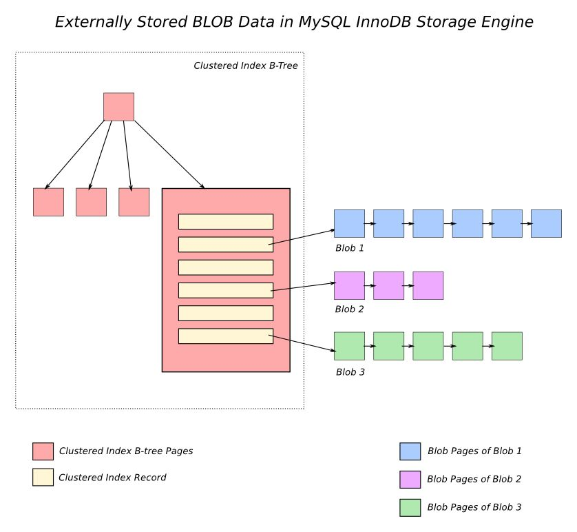 Postgres使用TOAST,这是一个专用的影子表(shadow table)存储。当行和列被选中时,大型对象就会被拉出。换句话说,大量的黑盒不会污染你宝贵的缓存。它还支持对TOAST对象的压缩。