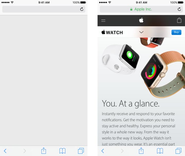 非控件轮廓区域的内容变动很大,以上图浏览器为例,Launch Screen仅仅显示工具栏和地址栏,网页内容区域留下了大量空白,显然这不是最好的界面加载过渡方案。