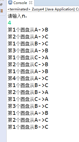 System.out.println("第"+n+"个圆盘从"+A+"->"+B);