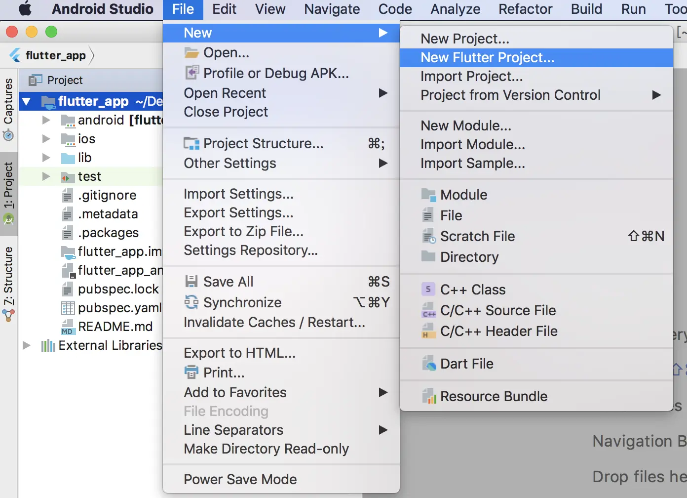 为了了解Dart的语法基础,这里我们使用Android Studio作为开发工具(你也可以使用dartpad来运行代码,它是一个基于浏览器的dart运行时环境),如果你按照上一篇文章中搭建好了Flutter开发环境,那么可以直接在Android Studio中新建Flutter项目,如下图所示: