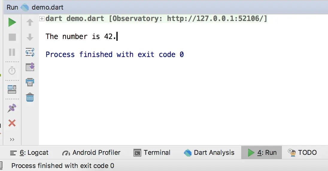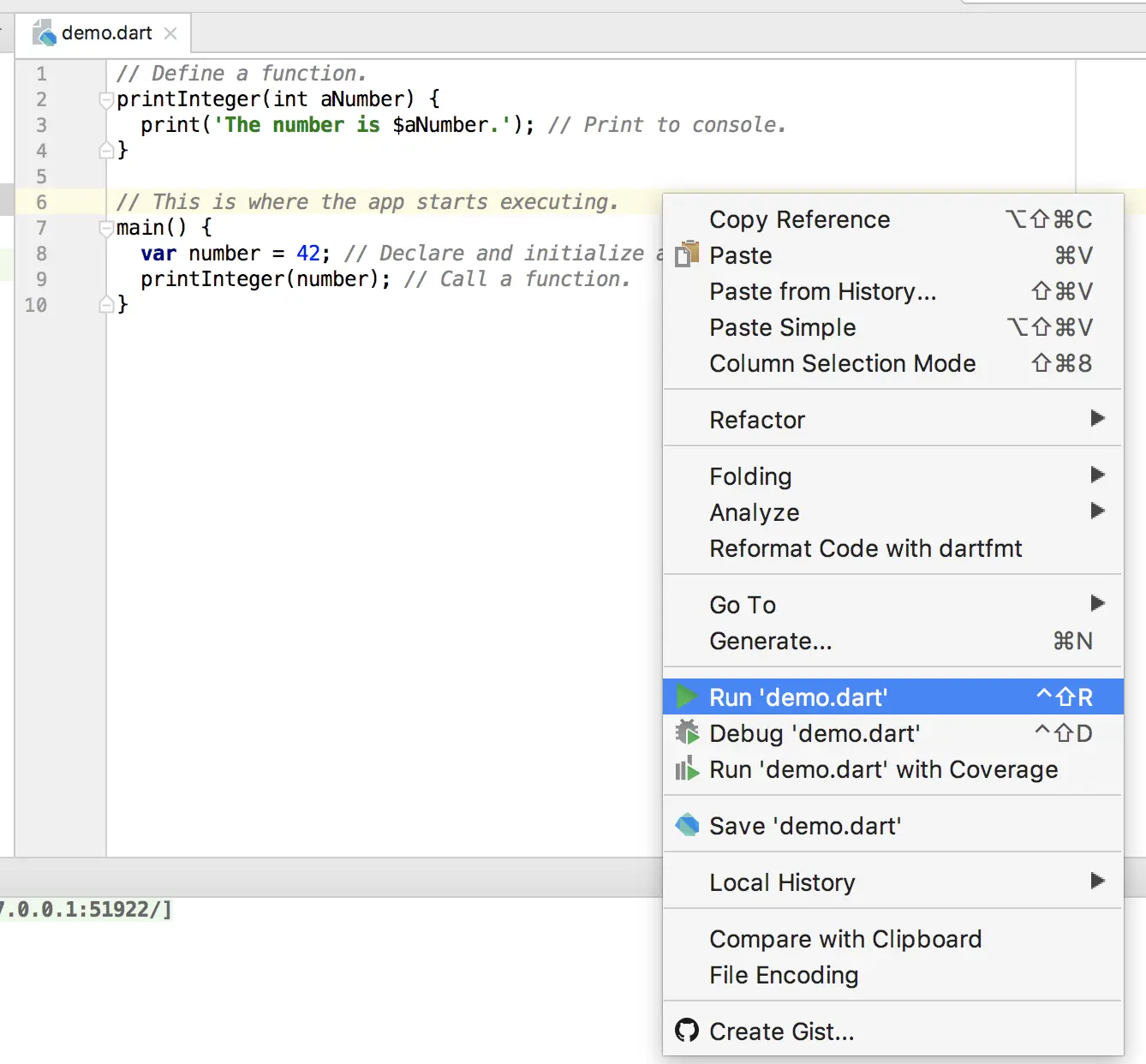然后在代码编辑区域鼠标右键,选择Run demo.dart,即可运行一个最简单的dart程序,如下图所示: