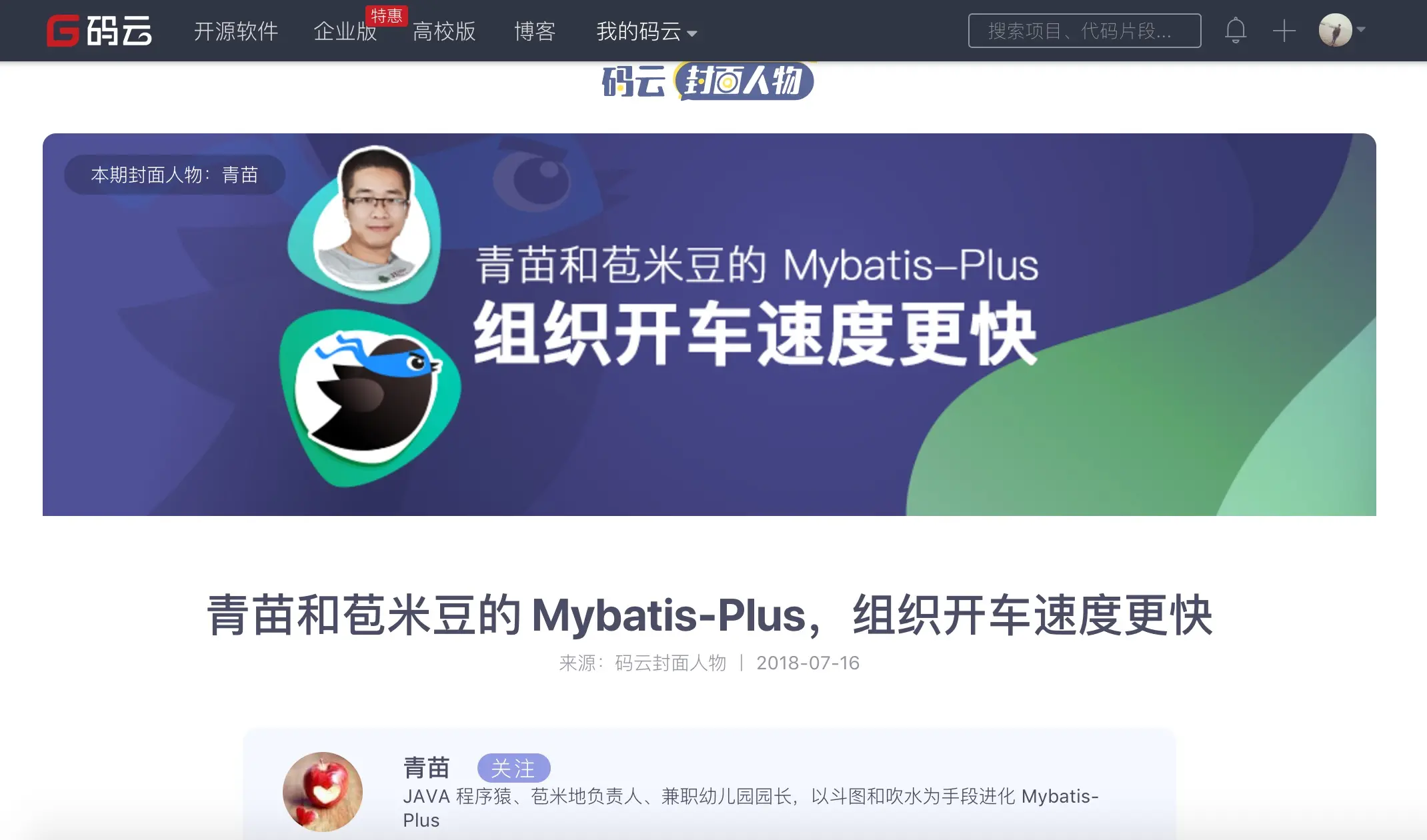 已经很久没有写文章了,最近家里有点事刚刚处理完,顺便也趁机休息了一段时间。刚回到公司看了一下码云,发现本期码云封面人员就是Mybatis-Plus团队苞米豆的负责人,如下图。