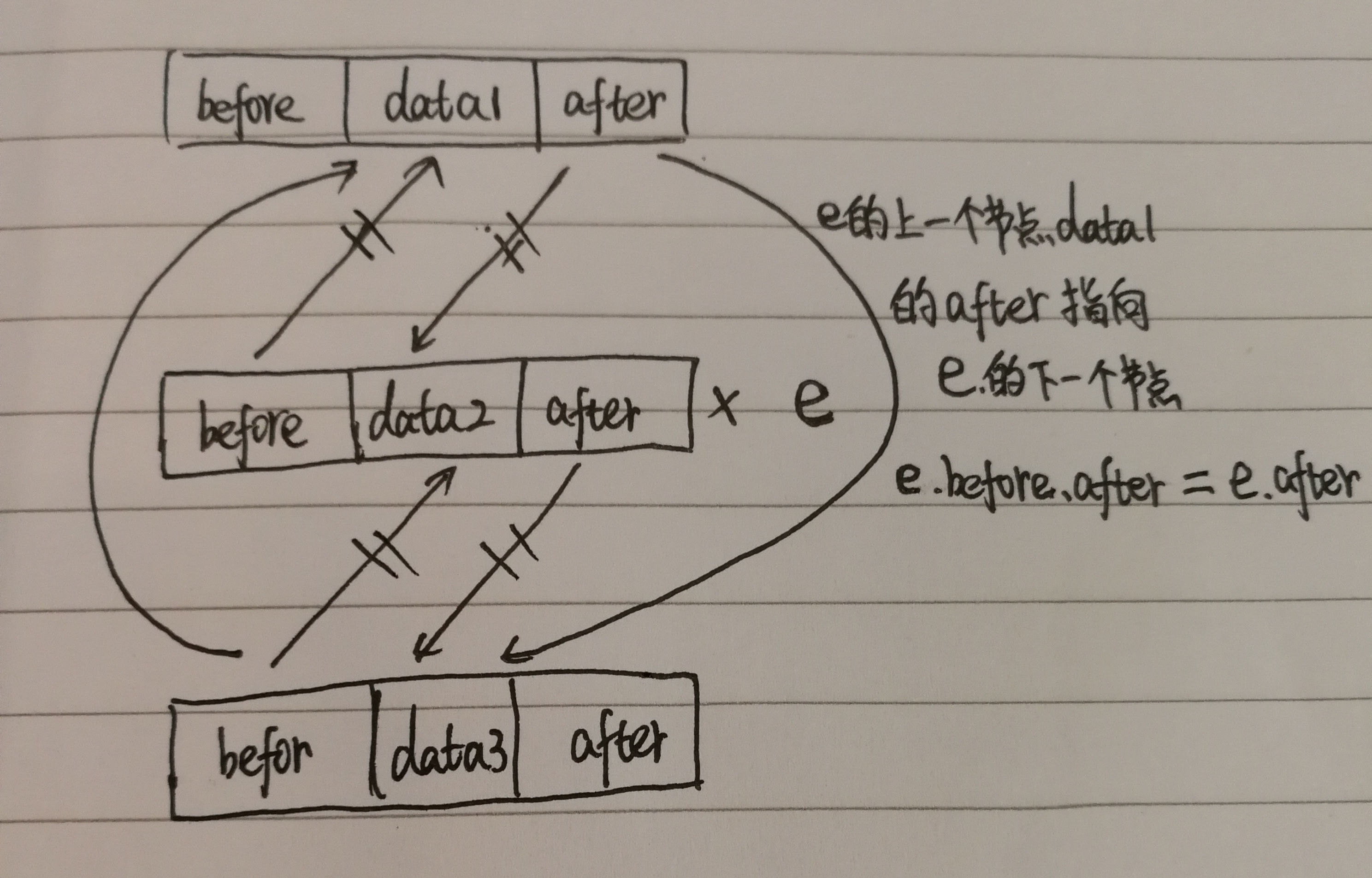 分析1:如果e是头结点,则head指向e.after;否则e的上一个节点的after指向e.after