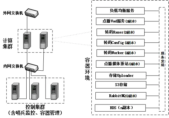 上图阐述了点播私有化平台的最小部署集群,其中控制集群包含通过基于Openstack进行的硬件资源虚拟化、Docker和Kubernetes实现的容器服务管理、基于虚拟资源和容器的哨兵监控以及账号管理。计算集群包含点播服务组件的部署以及依赖的存储、数据管理服务。
