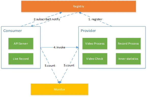 - Provider:调用远程服务的服务提供方。包含视频处理服务、视频检测服务、录制视频处理服务、统计服务。提供方服务部署采用Docker容器,利用容器的服务管理能力保障服务的稳定、高可用。