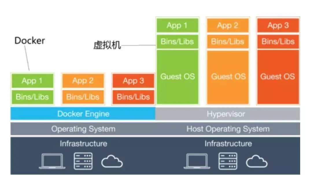 容器虚拟化没有 GuestOS,使用 Docker 时下载的镜像,只是为运行 App 提供的一个依赖的环境,是一个删减版本的系统镜像。一般情况下系统虚拟化没有容器虚拟化的运行效率高,但是系统安全性高很多。