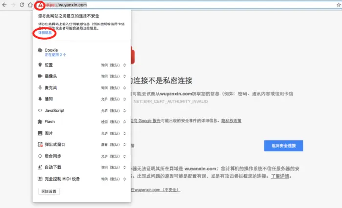 这时访问你的站点会得到一个不安全提示,因为你的证书不是一个有效的证书颁发机构颁发的。