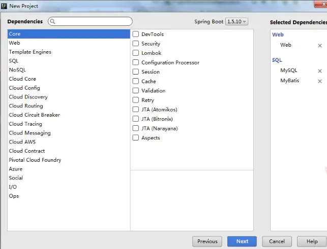 添加最基本的几个依赖 Web,MySQL,MyBatis,其他需求可以后续再添加 ; 数据库选择了 MySQL